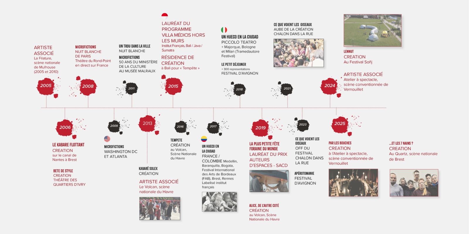 En 2013, il crée avec Emmanuelle Vo-Dinh, directrice du Phare, Centre National Chorégraphique du Havre, Histoires Exquises présentés à l’Atlas Theater de Washington DC. Il est par ailleurs artiste associé au festival de Poche de Hédé (de 2008 à 2010), à la Filature, scène nationale de Mulhouse (de 2010 à 2012), au Volcan, scène nationale du Havre (de 2011 à 2014), ainsi qu’à l’Atelier à Spectacle, scène conventionnée d’intérêt national art et création du pays de Dreux (2024-2026).